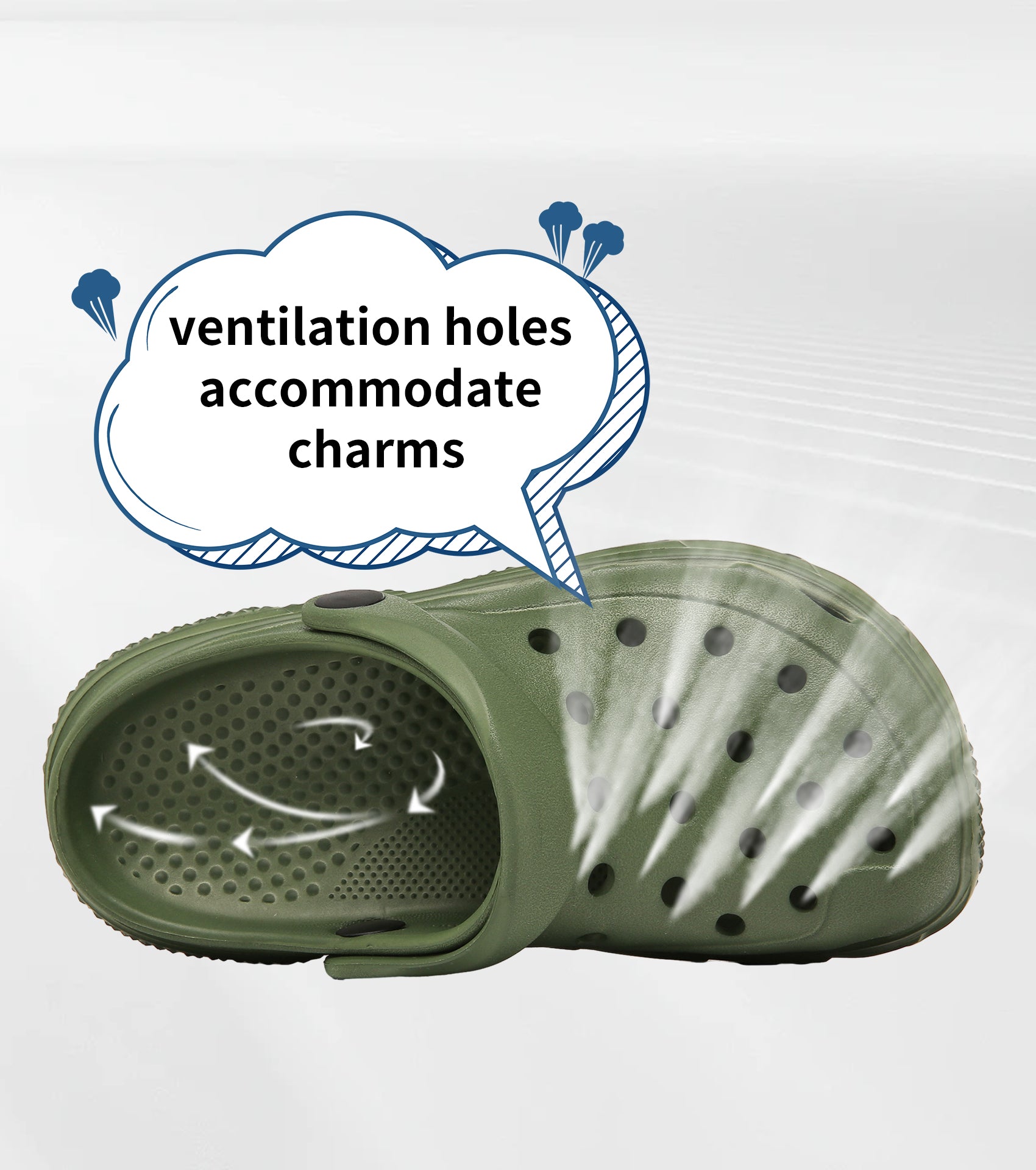 - Ventilation holes accelerate air circulation and accommodate shoe charms.