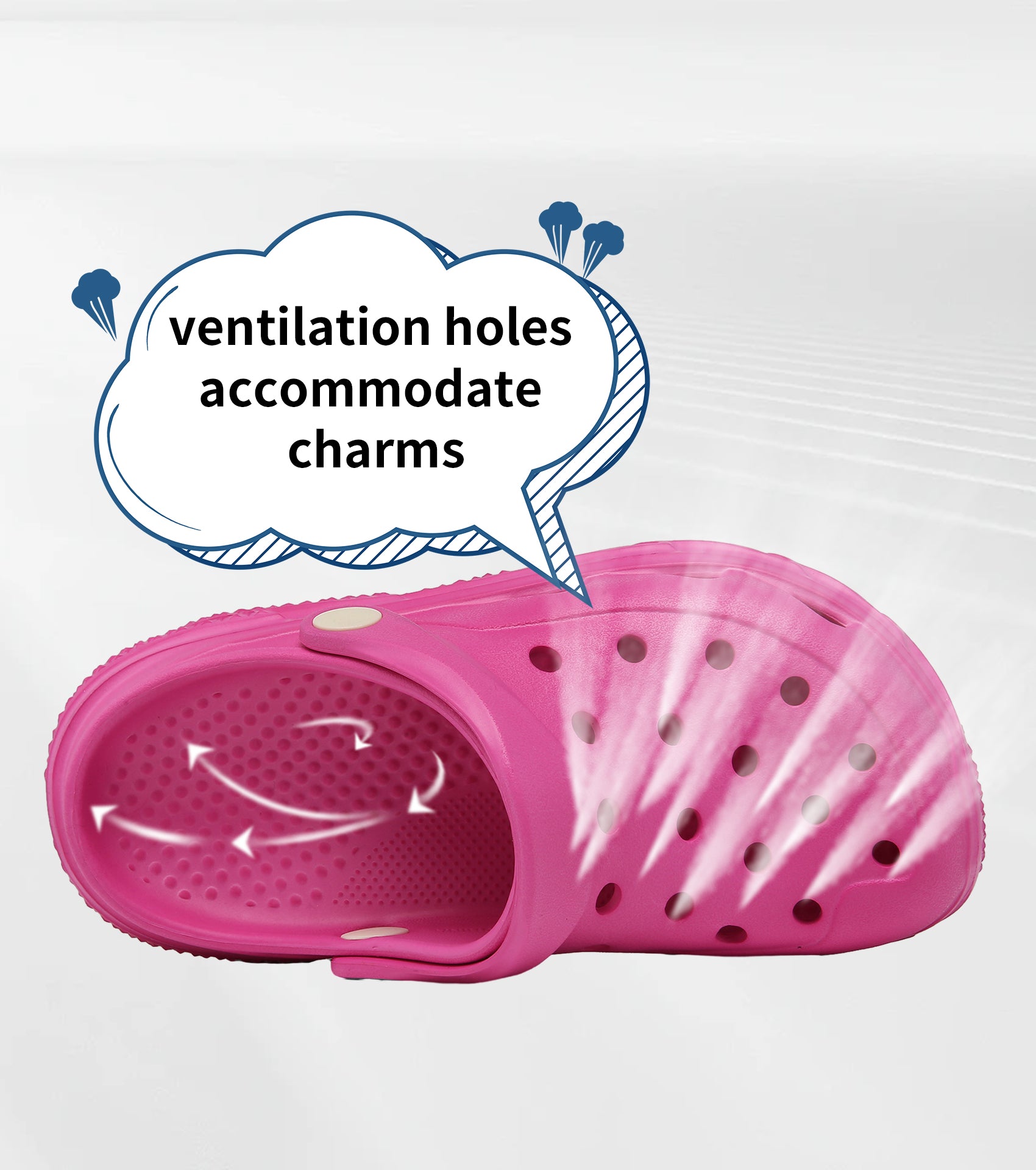 - Ventilation holes accelerate air circulation and accommodate shoe charms.